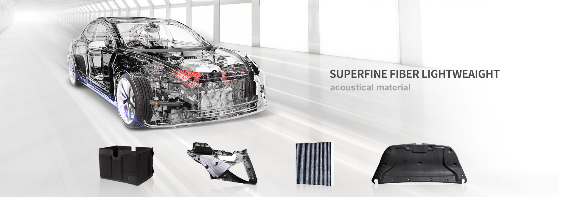 "Superfine fiber" lightweight acoustic material Suntai (3T) cooperates with top science & research institute at home and abroad of auto NVH materials, has independently developed and produced a new generation of auto superfine fiber lightweight acoustic materials, which can be customized to produce “superfine fiber” non-woven and molded raw materials according to different customers’ requirements, including suitcase system, carpet assembly, cowl thermal-insulation pad, bottom plate, fenders and power battery package for automotive interior accessories, to achieve the integrative solutions for automotive NVH noise reduction and purification.